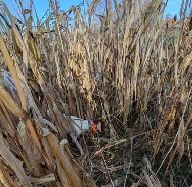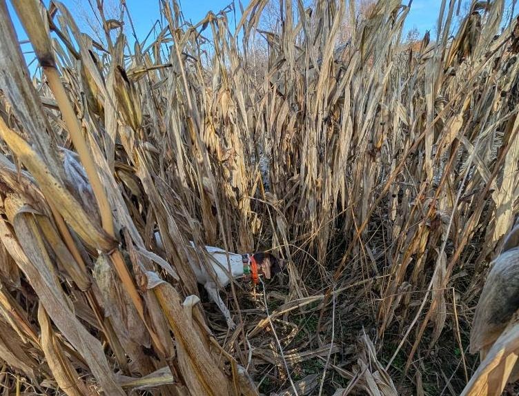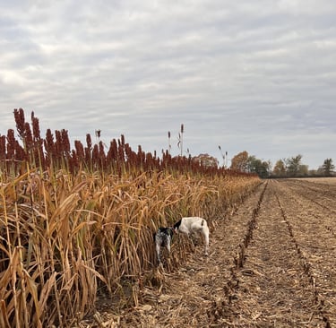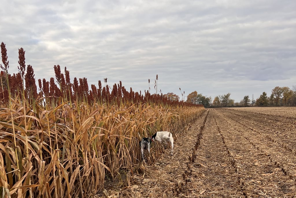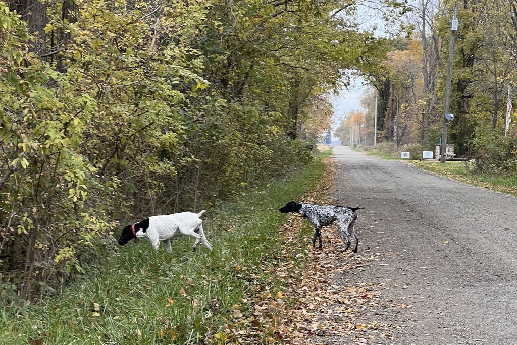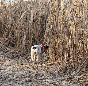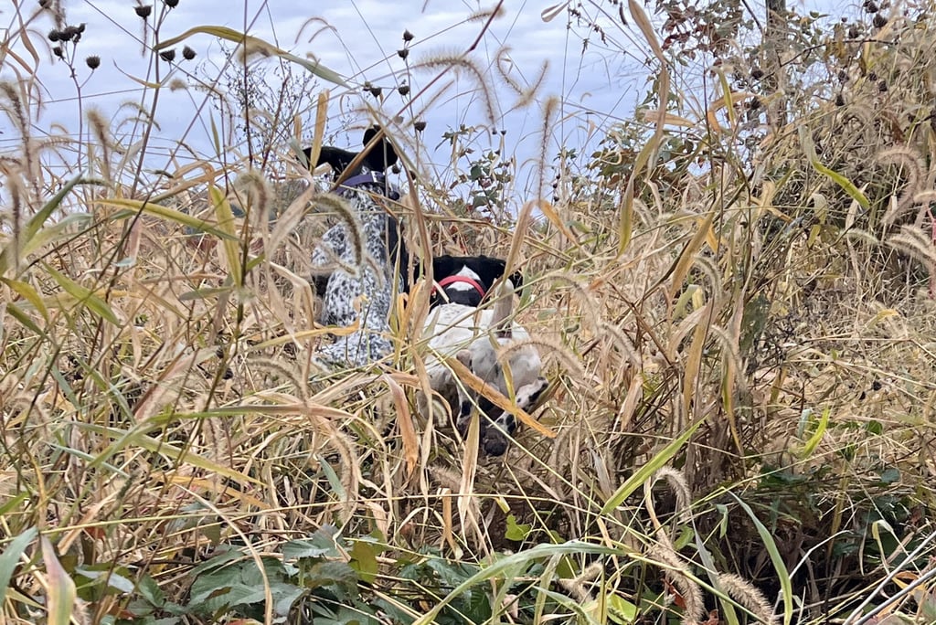 Here is Sampson on point with the bird hiding in the hedgerow. He has a really good nose. If he points, a bird is there somewhere. If he points again after a flush, there is another bird there. I can vouch for that! He is also a really good retriever. Such a Good Boy!